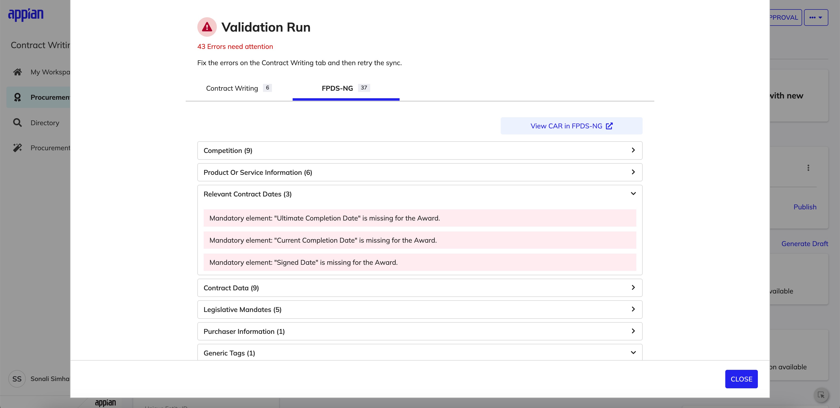 Here's the fundamental challenge: CW is supposed to be the source of truth for contract data, but it doesn't sync two-ways with FPDS-NG (the federal reporting system). So when validation errors come back from FPDS-NG, users have to go fix things in CW and re-send -- but that workflow was really confusing before I redesigned it.